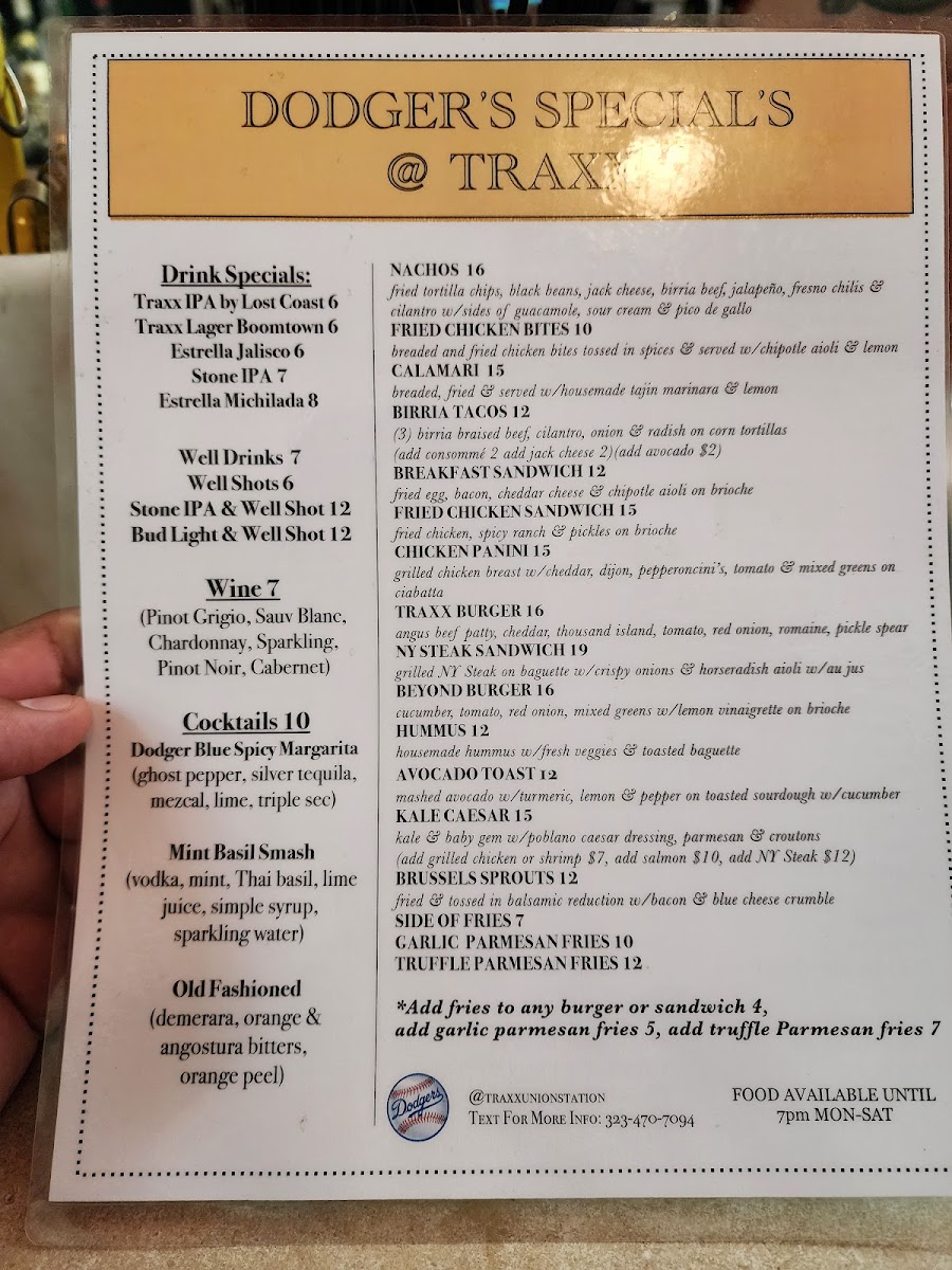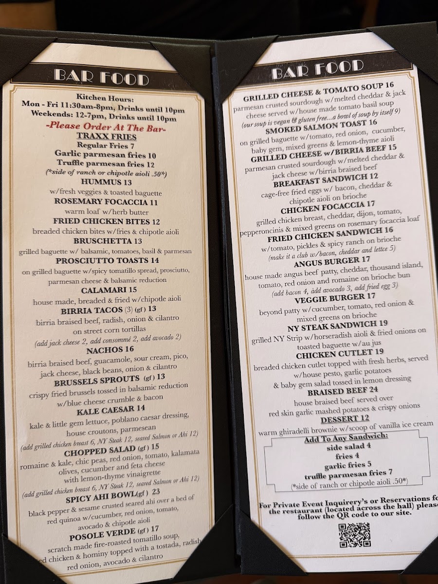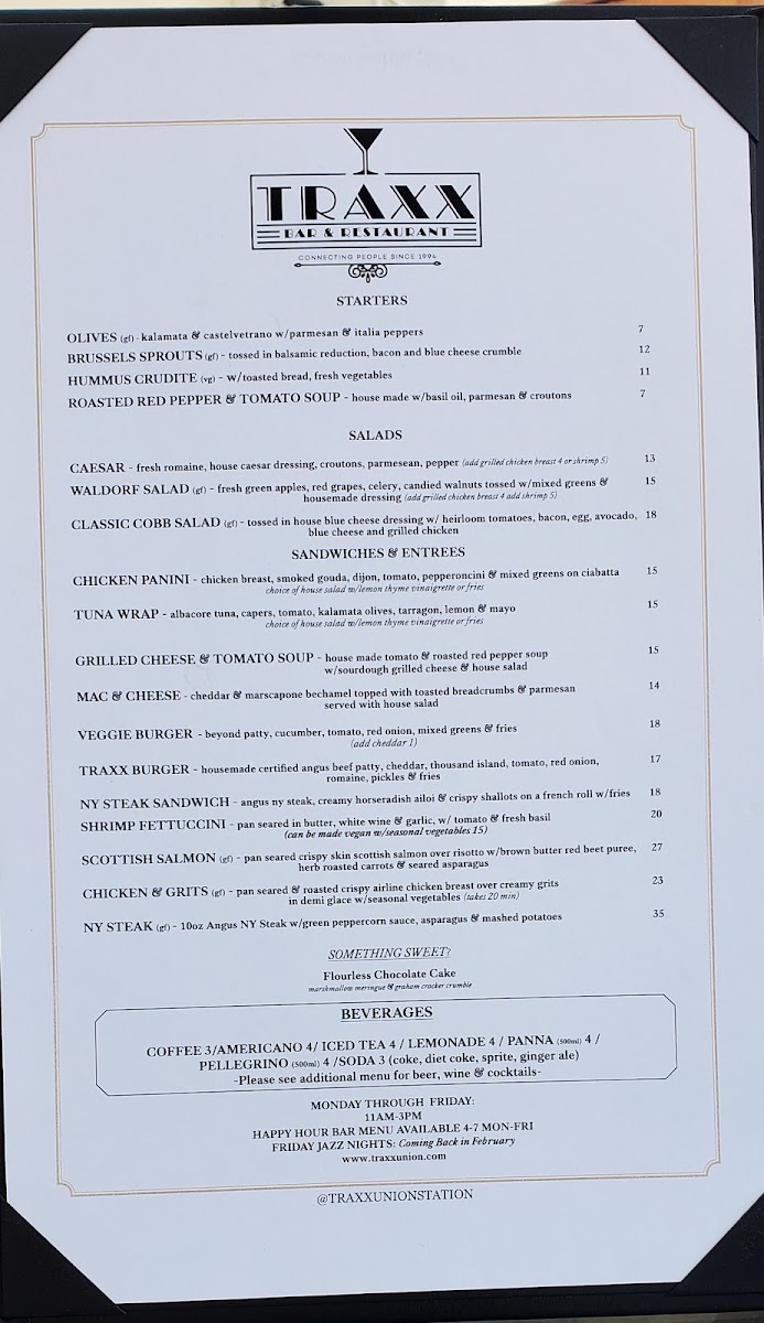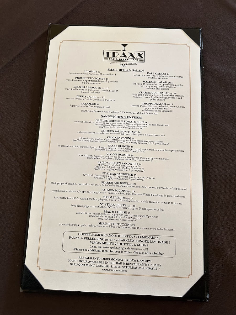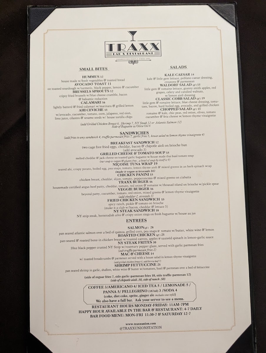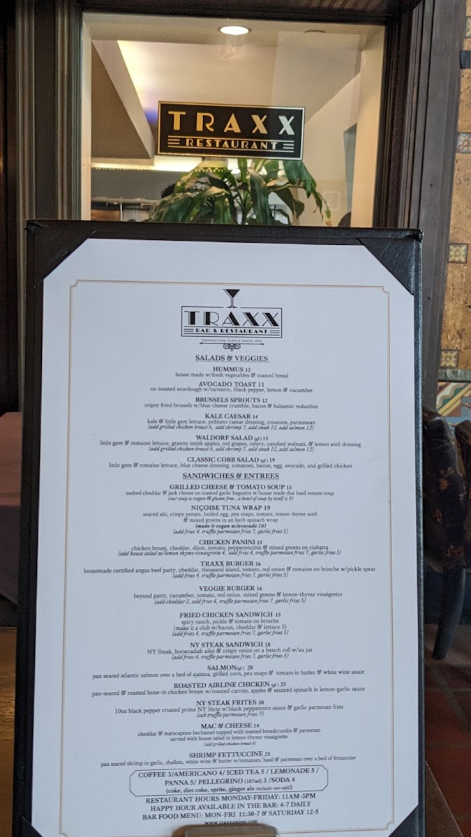 From a reviewer’s perspective, the menu at Traxx Restaurant, located at 800 N Alameda St UNIT 1 in Los Angeles, feels thoughtfully curated to balance freshness, comfort, and approachability. The salad selection sets a strong foundation, with the Kale Caesar, Classic Cobb Salad, and Chopped Salad offering familiar flavors that cater to both health-conscious diners and those craving something hearty yet light. Moving into the Small Bites & Entrées, the menu truly shines in its versatility: the Warm Rosemary Focaccia delivers a comforting, aromatic start, while Bruschetta and Hummus Prosciutto Toasts highlight simple ingredients elevated through careful preparation. The inclusion of Brussels Sprouts adds a satisfying, vegetable-forward option that rounds out the savory offerings nicely. To conclude the experience on a sweet note, the Warm Brownie serves as a classic, indulgent dessert that feels like a fitting reward after a well-balanced meal. Overall, Traxx Restaurant’s menu may not be extensive, but it is cohesive and intentional, focusing on quality, recognizable dishes, and a dining experience that feels both relaxed and refined-making it a memorable stop for casual lunches or laid-back dinners in downtown Los Angeles.